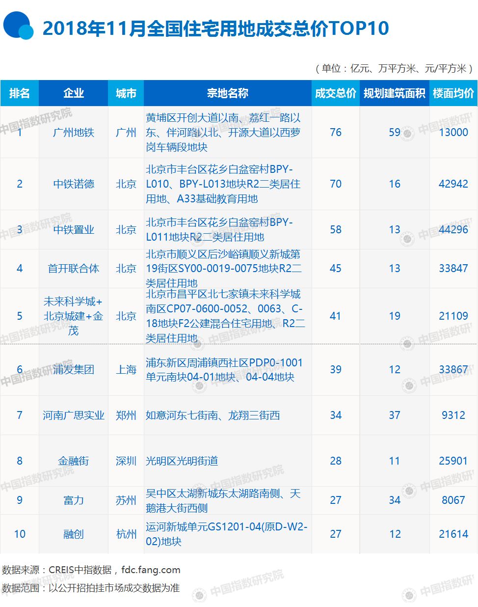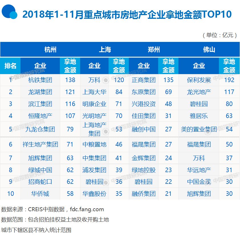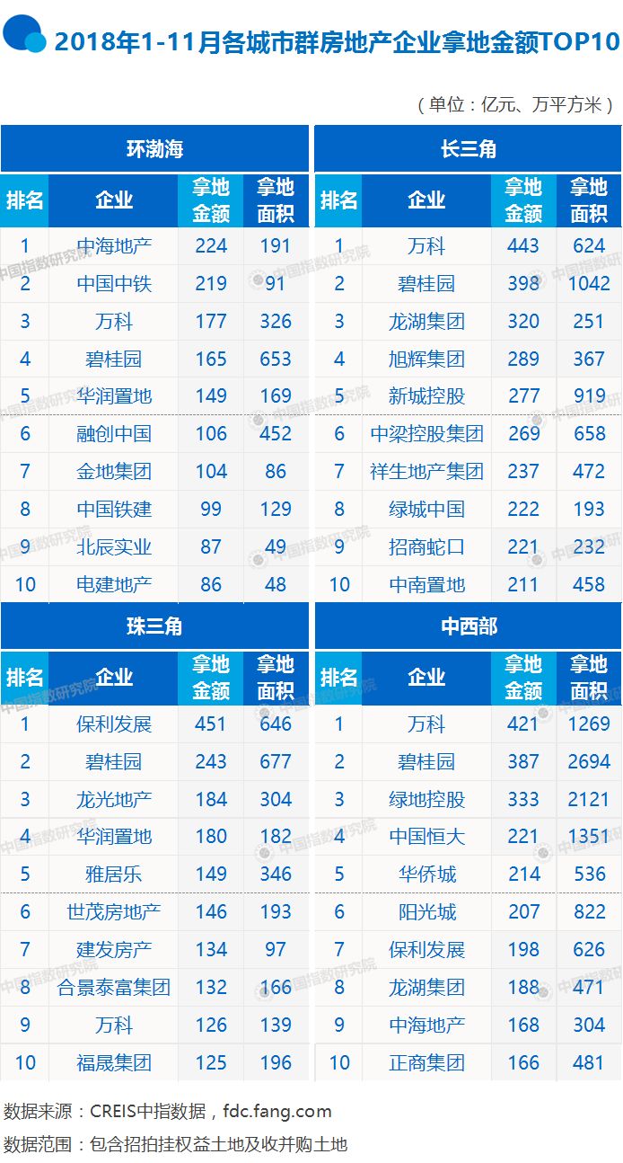 特别声明:房地产企业销售数据统计是以2018年1月1日-11月30日期间销售的商品房为统计口径,主要依据CREIS中指数据在各地的销售监测数据,并参考当期总体经营情况和推盘去化情况进行分析统计;对于少数没有在监测范围内的城市或项目,由企业提供相关证明文件,经课题组对数据进行严格审核,也纳入统计范围。本报告仅供参考,课题组不对使用报告及其内容所引发的任何直接或间接损失承担责任。 2018年,房地产市场逐步进入稳步发展阶段。2018年1-11月,TOP100房企销售额稳步增长,其中前10房企的销售总额达36691.6亿元,销售额占比达40.6%。 图:2018年1-11月房企各阵营的数量、销售额及销售面积均值情况 从销售情况来看,2018年前11月销售破千亿房企增至26家,TOP100门槛升至236.3亿元。分阵营来看,销售额超千亿的企业有26家,其中碧桂园、万科与恒大均超五千亿,3家企业销售额均值为5841.7亿元,同比增长率均值为18.7%;1000-5000亿的企业共23家,销售额均值为1725.3亿元,同比增长率均值为58.3%,其中,融信、蓝光发展两家企业本月首次跨入千亿阵营。500-1000亿的企业有27家,销售额均值为675.8亿元;100-500亿的企业销售额均值为317.7亿元;TOP100门槛升至236.3亿元。 2018年以来,在国家政策的鼓励下,房地产企业积极通过资产证券化进行融资,行业资产证券化融资规模迅速增长。根据Wind数据及企业公告初步统计,1-11月,房企共发行资产证券化产品154只,融资总额1725.1亿元,同比增长56.1%,11月,房企共发行资产证券化产品16只,融资总额147.4亿元,环比增幅超100%。 表:代表房企2018年11月资产证券化融资案例 数据来源:根据Wind资讯、企业公告综合整理 从资产证券化的资产标的类型来看:11月,房企资产证券化产品资产标的多为应收账款,其次为租赁租金、物业费等。其中,万科发行资产证券化产品6只,资产标的均为应收账款,共获资金52.84亿元;金茂以物业费作为底层资产,获得15.4亿元资金;越秀以租赁租金作为资产标的发行资产证券化产品,获得资金10.91亿元。 面对当前国内融资环境,房企积极通过发行住房租赁专项公司债券进行融资。11月,万科20亿元住房租赁专项公司债于深交所上市,票面利率仅为4.18%;龙湖提交了规模为50亿元的住房租赁专项债券申请,发行期限不超过15年等。 总体来看,资产证券化产品能够盘活企业存量资产,拓宽企业融资渠道,助力企业未来发展;同时,随着房地产市场从增量进入存量时代,租赁市场正成为资本角逐的新蓝海。未来,房企应积极把握资产证券化融资机会,并结合自身情况发行租赁类融资产品,不断优化债务结构,获取优质发展资源。 伴随房地产市场调控的深入,规模化成为撇不开的情结,房企在业绩竞赛中加速奔跑,与此同时,房企土地储备规模与结构对业绩的影响越来越大。在此背景下,中国指数研究院对房企拿地情况进行研究,关注房企在土地一二级市场拿地的最新动态与热点,为研判行业趋势提供参考。 拿地金额方面,万科、碧桂园、保利继续位列榜单前三。其中,万科以1250亿元拿地金额位居榜首,碧桂园则以1200亿元位列第二,保利以926亿元稳居第三位,三家房企的拿地金额均超900亿,万科和碧桂园更是以超1200亿元的拿地金额领先行业。TOP10企业1-11月拿地总金额达7609亿元,占TOP50企业的42.7%,较1-10月占比下降1.6个百分点,龙头房企在土地市场的优势凸显。2018年1-11月,万科继续通过招拍挂积极拓储,11月以15.99亿元获得中山市东区博爱七路地块;华润置地以22.20亿元拿下深圳光明区马田街道地块;中梁以总价18.63亿元摘得温州城市中心区地块。 限地价、限房价、竞自持、竞配建、共有产权用地等成为热点城市推地的重要要求,对于企业来说,这些限制条件对项目盈利和周转带来一定压力,且对企业资金实力提出了更高的要求。其中,中梁以18.63元竞得温州主城区商住地块,出让方式为“限房价、竞地价”;中铁建以12.50亿元拿下珠海金湾区地块,该地块采用“限地价、竞配建人才住房”方式出让。 从各城市群拿地金额来看,长三角仍是房企重点关注区域,中西部关注度继续提升。长三角作为一个多核心发展的区域,其领先的经济水平、发达的交通以及完善的配套设施吸引着大量优秀人才,再加上长三角城市群推出土地的城市数量较多,土地市场持续火热,一直被视作房企重点投资的区域。同时,随着中西部地区经济崛起及产业转移,中西部地区土地市场热度升温。2018年1-11月,长三角地区TOP10企业拿地总额达2887亿元,位列首位;中西部和珠三角以2503亿元和1870亿元分列第二、第三位;环渤海地区拿地总额位居第四位,为1416亿元。 从城市群拿地企业来看,龙头房企继续坚持广布局策略,中小房企则聚焦区域深耕发展战略。如碧桂园、万科在4个榜单中均有上榜,其中万科在长三角和中西部区域榜单中以443亿元及421亿元位列榜首,在环渤海区域榜单中位列第三,珠三角地区榜单中则处于第九位;碧桂园在长三角、珠三角及中西部区域榜单中均居于第二位,在环渤海区域榜单中也以165亿元位列第四名;中海在环渤海和中西部榜单中均有上榜,并以224亿元拿地总金额位居环渤海榜首;保利则在珠三角和中西部区域榜单上榜,且以451亿元位列珠三角区域榜单首位;华润置地在各城市群榜单中出现两次,北辰、福晟等中小型房企则出现一次,拿地相对较为集中。 从城市排行榜来看,房企仍将一二线城市